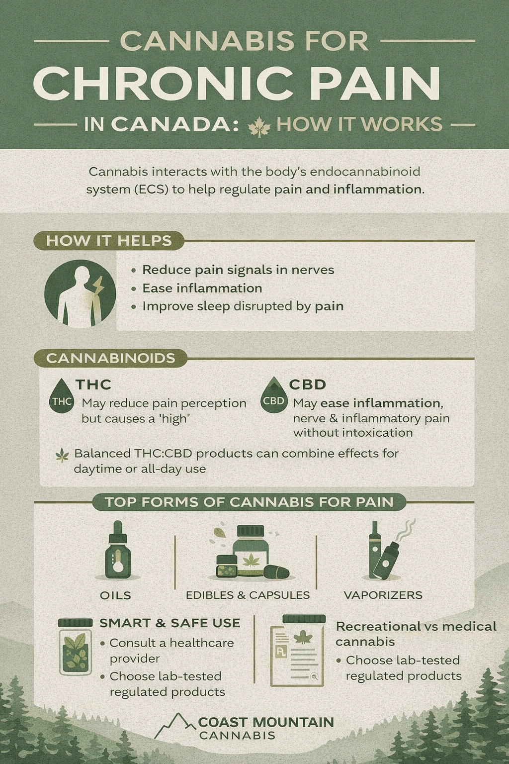 Cannabis has become an important option in chronic pain management in Canada, offering flexibility, multiple delivery methods, and individualized cannabinoid profiles. When used responsibly and under medical guidance, it may help improve comfort, sleep, and daily functioning for many Canadians living with chronic pain.